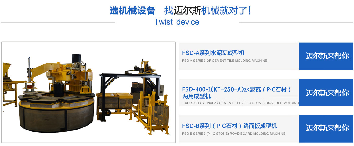 常熟市邁爾斯機械有限公司是一家集研發(fā)、生產(chǎn)、銷售于一體的建材機械高科技企業(yè),其前身為2011年注冊創(chuàng)辦的“常熟市虞山鎮(zhèn)豐順達(dá)機械配件廠”,經(jīng)過多年的努力,于2017年注冊成立“常熟市邁爾斯機械有限公司”,專業(yè)生產(chǎn)模壓水泥彩瓦機、P.C石材機、轉(zhuǎn)盤式成型機、彩色路面磚機等綠色建材設(shè)備。公司以市場為龍頭,以技術(shù)為導(dǎo)向,開發(fā)了系列化、標(biāo)準(zhǔn)化的適銷對路的機械產(chǎn)品,并且注冊了多項國家專利技術(shù),銷售范圍覆蓋全國,并且出口越南、老撾等東南亞和其它國家。